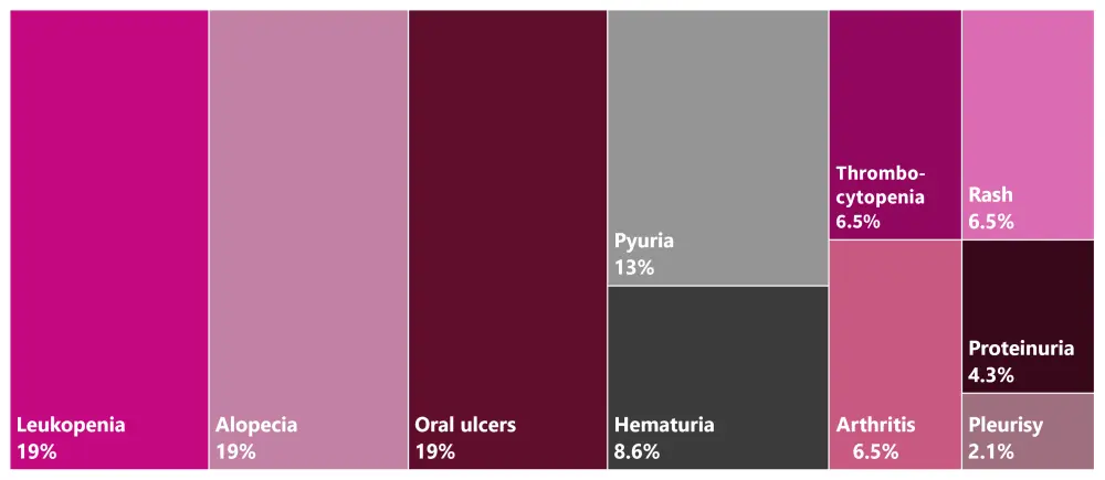 Among 219 patients not meeting the DORIS remission criteria, 78.9% patients were classified as not in state of remission by their physician (Figure 2). The reason for disagreement in 46 patients was that 39 (84.5%) patients did not meet the criterion of Clinical SLE Disease Activity Index (cSLEDAI) = 0 (median [IR] cSLEDAI was 3 [1–8]). The most common manifestations in these patients are shown in Figure 3.