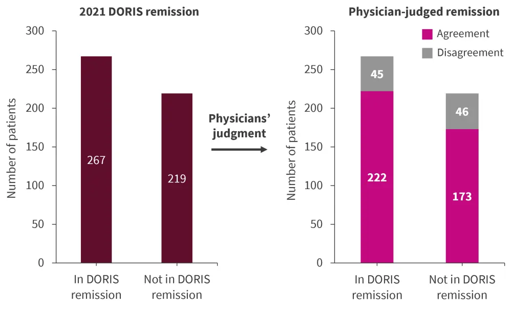 The overall agreement between the 2021 DORIS remission and physician-judged remission/SACQ was 81.2% (95% confidence interval, 79.9–82.9%) and Cohen’s kappa agreement was 0.62 (0.55–0.69). Of 267 patients in remission as per the 2021 DORIS criteria, 83.1% patients were classified as in remission/SACQ by their physician (Figure 2).