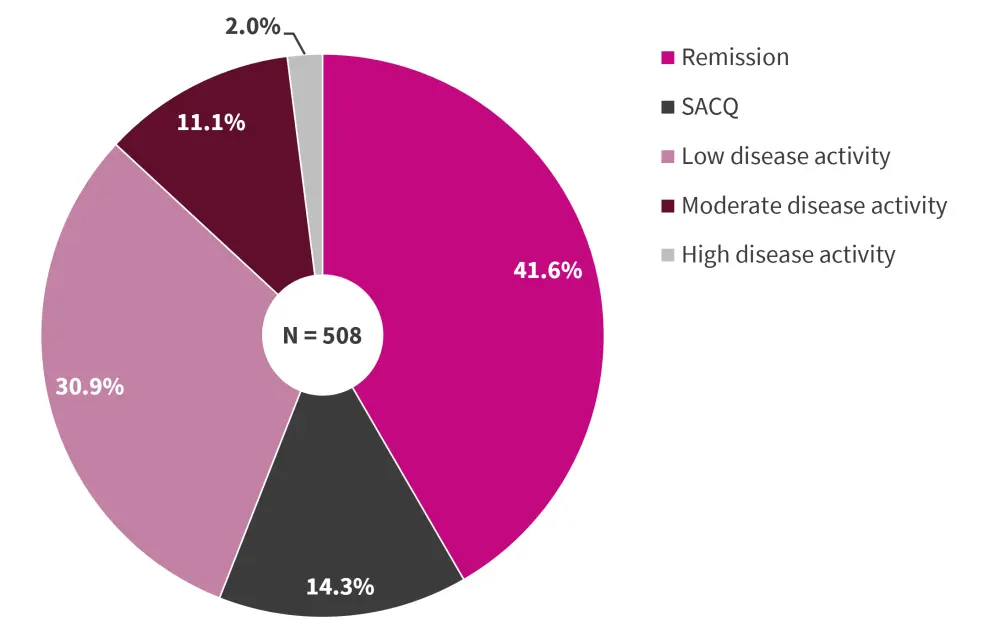 On the other hand, as per physicians’ assessment and judgement, 55.9% of the patients were classified as in remission (41.6%) or SACQ (14.3%), as shown in Figure 1.