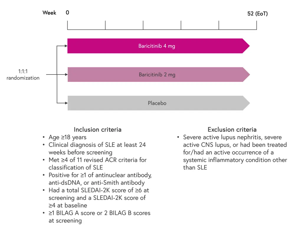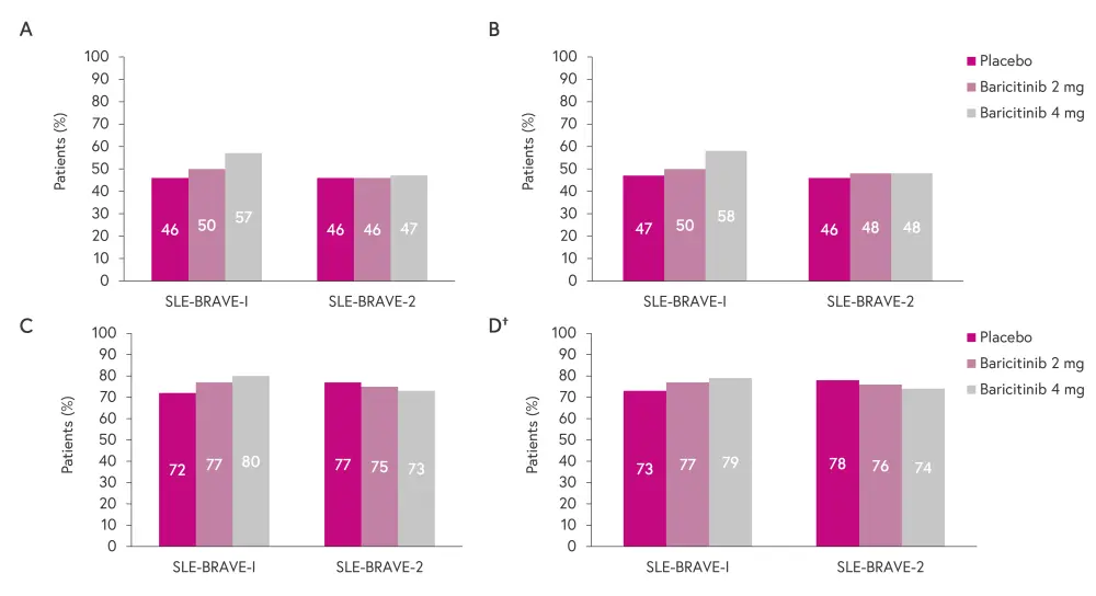 The primary endpoint for both trials was the proportion of patients achieving a SLE Responder Index (SRI)-4 response at Week 52 in the baricitinib 4 mg group compared with placebo group.1,2 Secondary endpoints included: