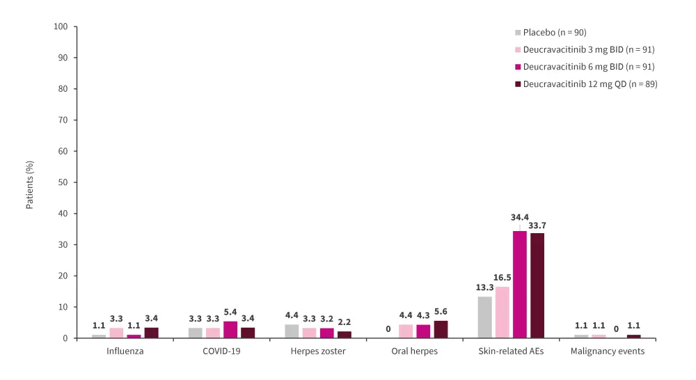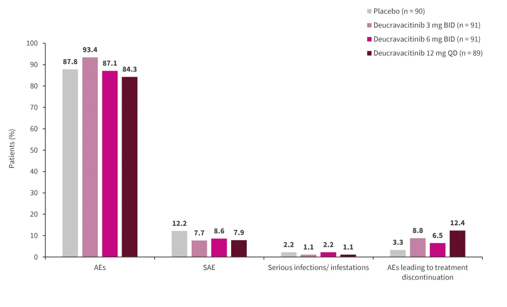 Serious AEs remained similar in the treatment groups compared with placebo, with the main AEs recorded being infections or infestations (Figure 4). Skin related AEs, such as acne and rashes, were elevated in the 6 mg twice daily and 12 mg once daily treatment groups at 34.4% and 33.7%, respectively. No cardiac or thromboembolic events were recorded (Figure 5).