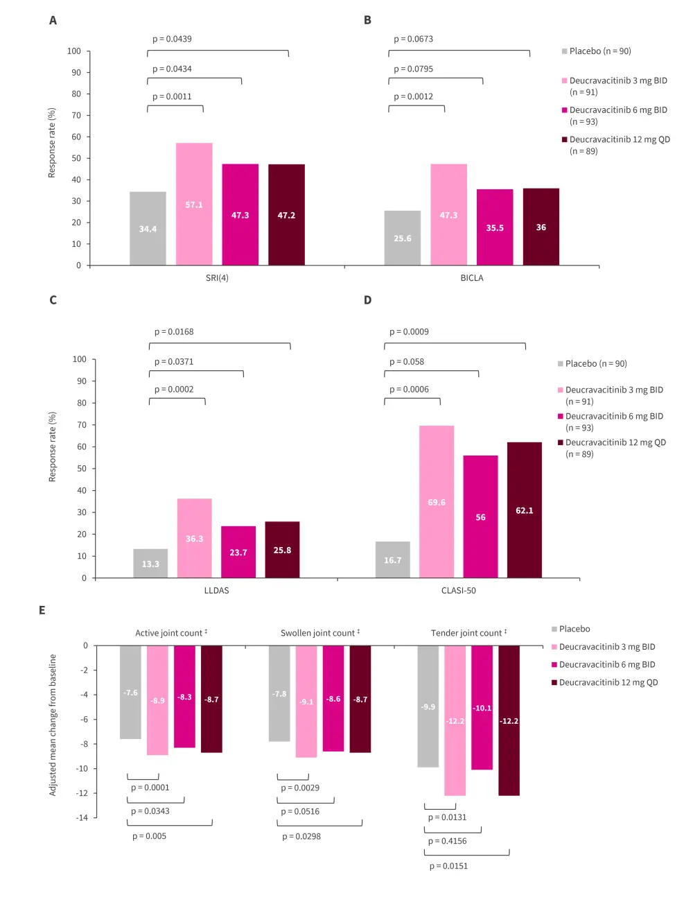 BICLA, British Isles Lupus Assessment Group-based Composite Lupus Assessed; BID, twice daily; CI, confidence interval; CLASI-50, Cutaneous Lupus Erythematosus Disease Area and Severity Index Activity; LLDAS, lupus low disease activity state; QD, once daily; SRI, Systemic Lupus Erythematosus Responder Index.