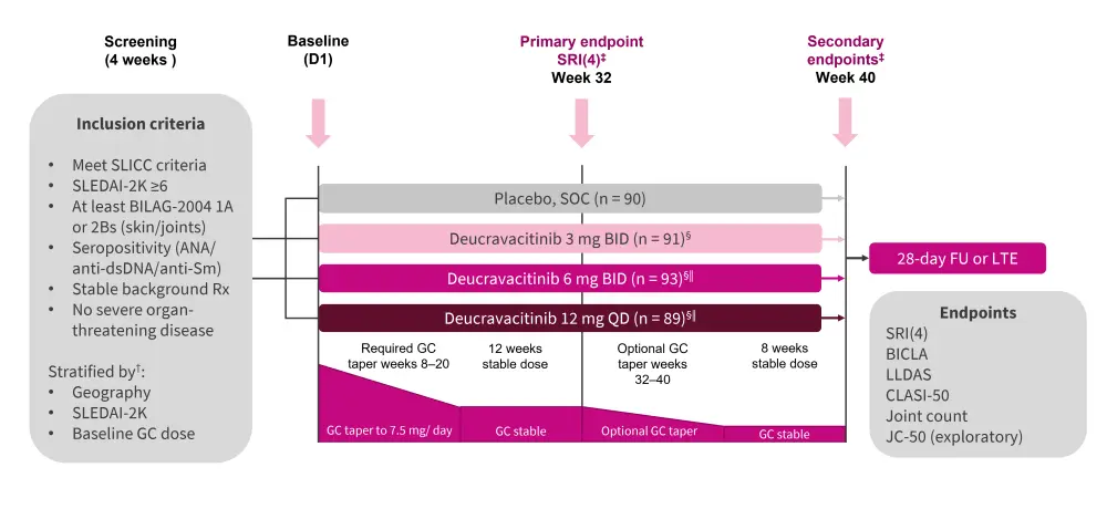 ANA, antinuclear antibody; anti-Sm, anti-smith; anti-dsDNA, anti-double stranded DNA; BID, twice daily; BILAG, British Isles Lupus Assessment Group; CLASI-50, Cutaneous Lupus Assessment Erythematosus Disease Area and Severity Index; FU, follow-up; GC, glucocorticoid; JC, joint count; JC-50, ≥50% improvement from baseline active joint counts; LLDAS, Lupus Low Disease Activity State; LTE, long-term extension; QD, once daily; SLE, systematic lupus erythematosus; SLEDAI-2k, SLE Disease Activity Index; SLICC, Systematic Lupus International Collaborating Clinics; SOC, standard of care; SRI, SLE Responder Index.