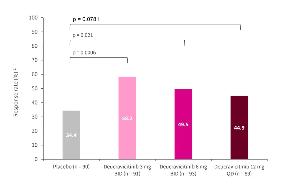 †Assessed by non-responder imputation. All randomized patients assessed; missing data, prohibited medication use, or early discontinuation analyzed as a nonresponse. Number of patients in each group were: placebo n = 90, deucravacitinib 3 mg BID n = 91, deucravacitinib 6 mg BID n = 93, and deucravacitinib 12 mg QD n = 89.