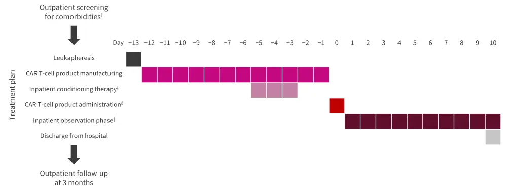 §Administered as a single infusion (IV) on Day 0 at a fixed dose of 1 × 106 CAR T cells per kg body weight.