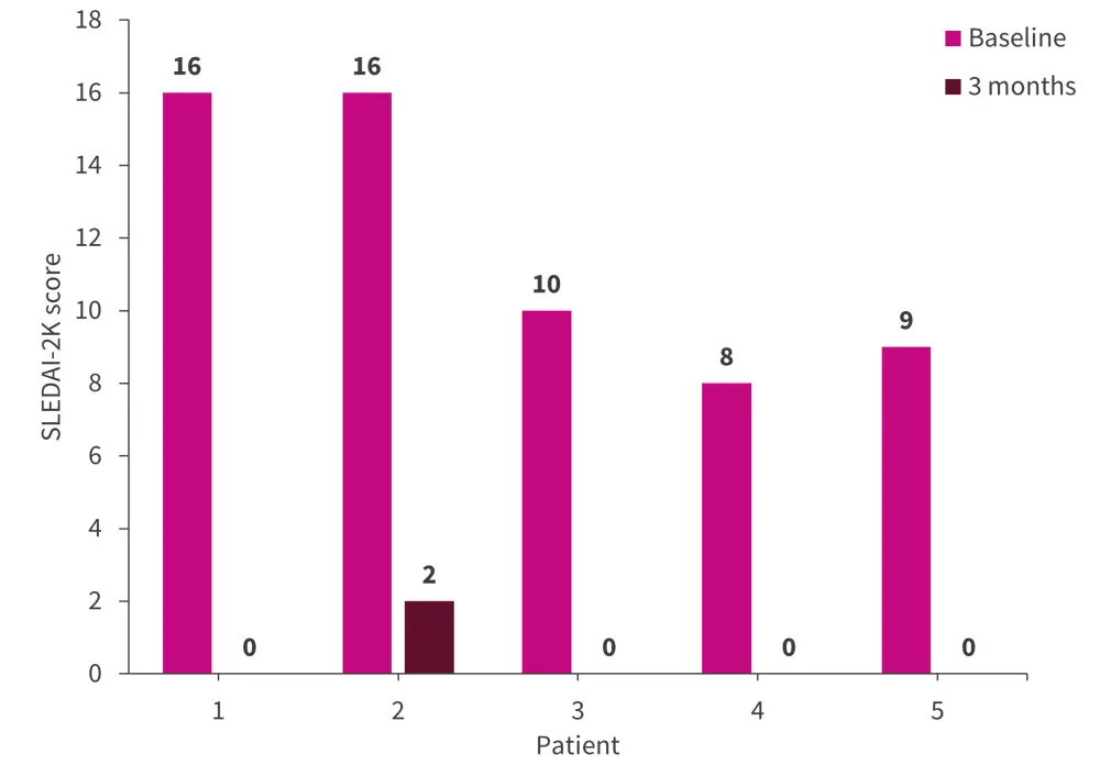 In addition, nephritis ceased after CD19 CAR T-cell treatment, there was normalization of complement factor levels, and a reduction in anti-dsDNA antibody levels in all five patients. With regards to severe manifestations of SLE, the following either reduced or disappeared after administration of CAR T cells: