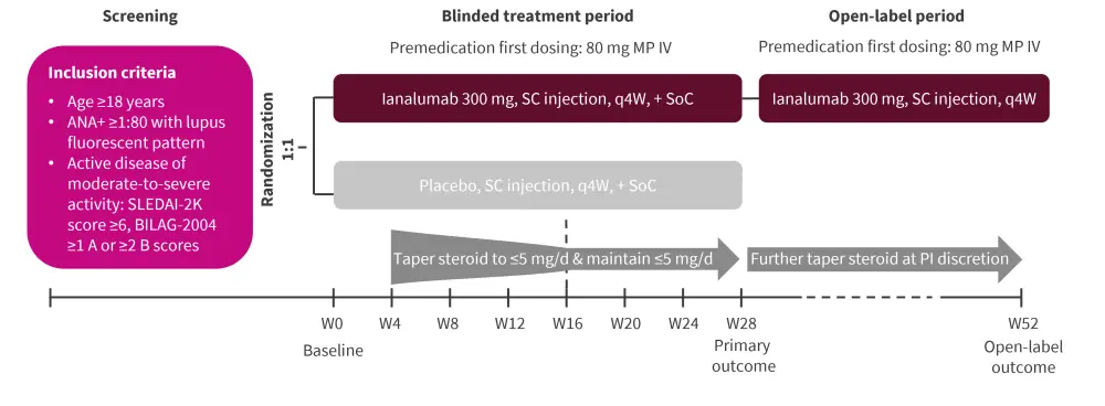 ANA, antinuclear antibody; BILAG, British Isles Lupus Assessment Group; d, day; IV, intravenous; MP, methylprednisolone; PI, principal investigator; q4W, every four weeks; SC, subcutaneous; SLEDAI-2K, Systemic Lupus Erythematosus Disease Activity Index 2000; SoC, standard of care; W, week.