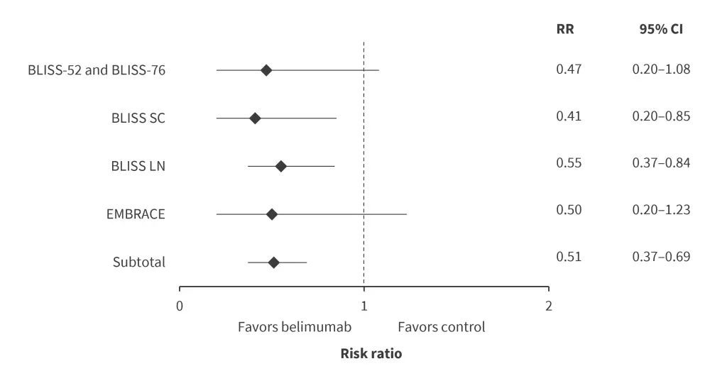 In the pooled analysis these studies, risk of renal flares was significantly lower in the belimumab group compared with the control group (Figure 1).1