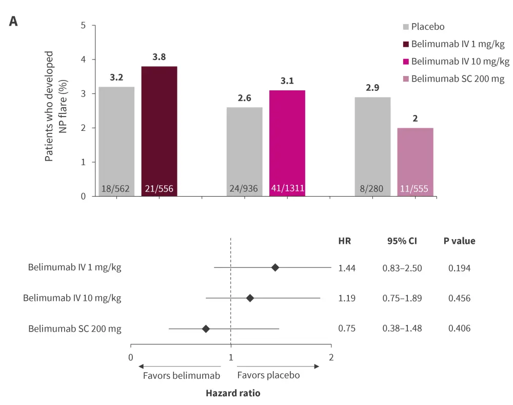 At the EULAR 2023 Congress, Palazzo et al.8 presented another post-hoc analysis on the impact of belimumab on NP flares in patients with SLE. The study utilized the same five studies as the Parodis et al.7 study mentioned above.