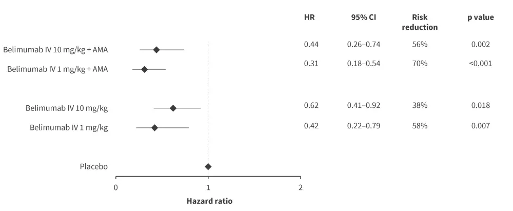 Fewer patients in the belimumab group had a renal flare compared with placebo (4.7% vs 7.5%; HR, 0.57; 95% CI, 0.32–1.01; p = 0.0532). |