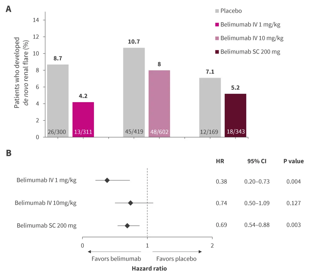 The study revealed a significant reduction in the occurrence of de novo renal flare among patients treated with belimumab IV 1 mg/kg compared with those treated with placebo, whereas belimumab IV 10 mg/kg and belimumab SC 200 mg was not significantly different to placebo (Figure 2A).