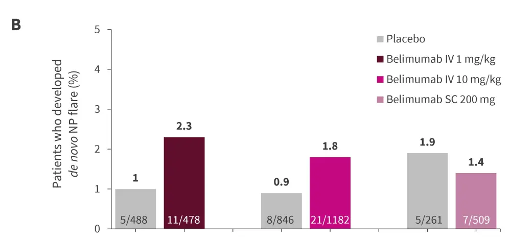 After 52 weeks of follow-up, there were no significant differences in occurrence of NP/SLE flare (Figure 4A) and de novo NP/SLE flare (Figure 4B) in patients treated with belimumab and those treated with placebo.