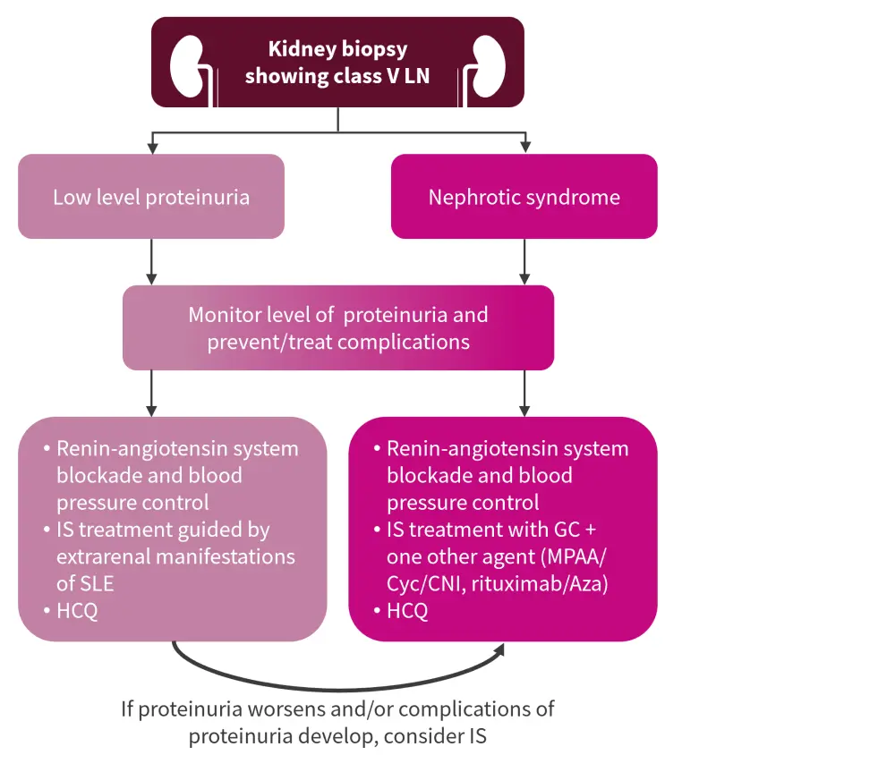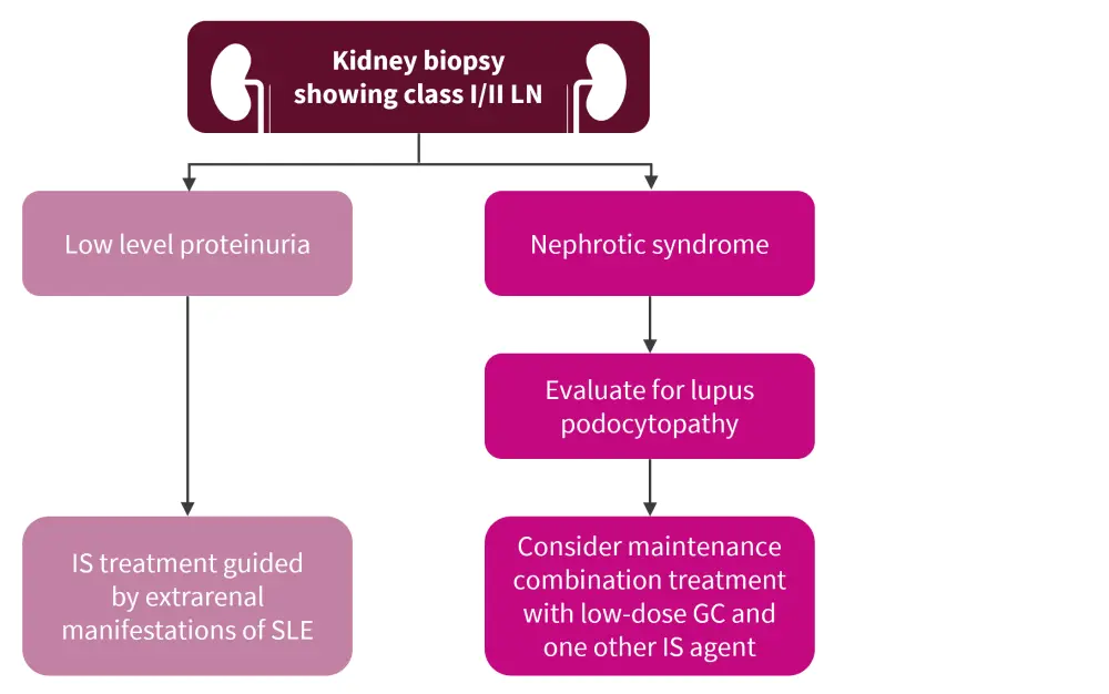 The EULAR 2019 recommendations differ slightly from those shown in Figure 1 (adapted from the KDIGO 2021 guidelines2) in that no specific recommendations for immunosuppressive treatments are made aside from the therapy selected to manage general non-renal systemic lupus erythematosus (SLE) symptoms. Repeat biopsies are advised in the EULAR recommendations if there is significant proteinuria to detect class changes.