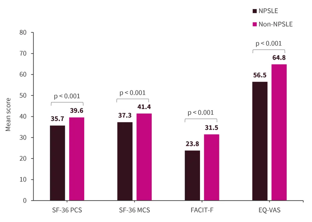 Patients with NPSLE vs non-NPSLE reported lower SF-36 physical component summary, SF-36 mental component summary, EQ visual analogue scale, and FACIT-F scores (Figure 1).