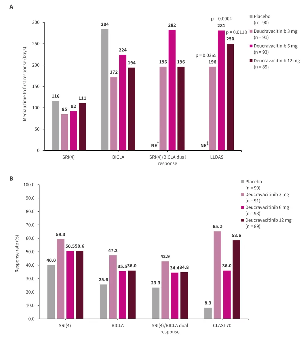 Figure 1. A Median time to onset of SRI(4), BICLA, dual SRI(4)/BICLA, and LLDAS response and B response rate with SRI(4), BICLA, dual SRI(4)/BICLA, and CLASI-70*