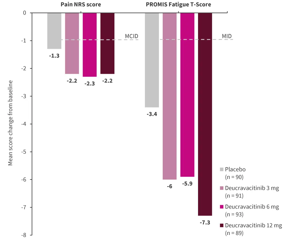 Mosca et al.6 assessed patient-reported outcomes and revealed that deucravacitinib achieved clinically meaningful improvements (meeting or exceeding minimal clinically important/minimally important differences) in pain, fatigue, and health-related quality of life from baseline at Week 48 (Figure 2).