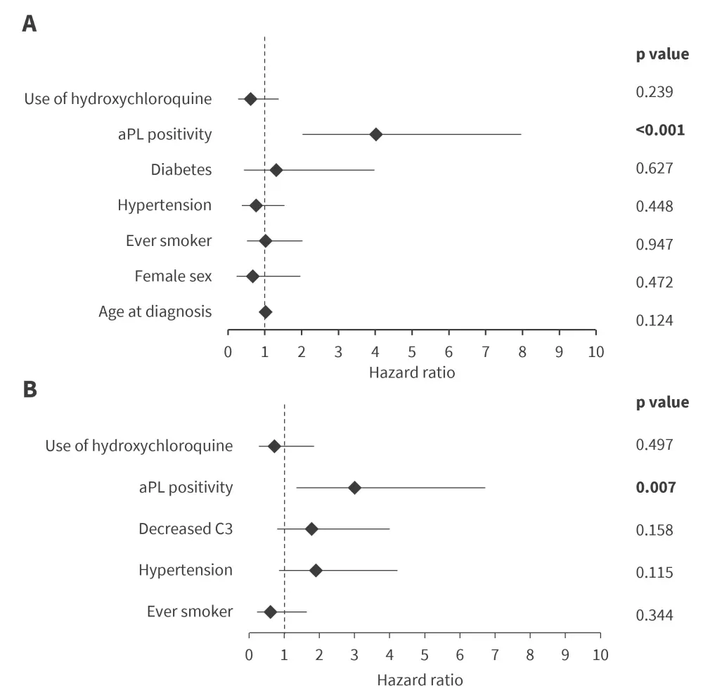 The multivariable Cox proportional hazards model further confirmed aPL positivity to be the sole factor significantly associated with CVE (Figure 1B).