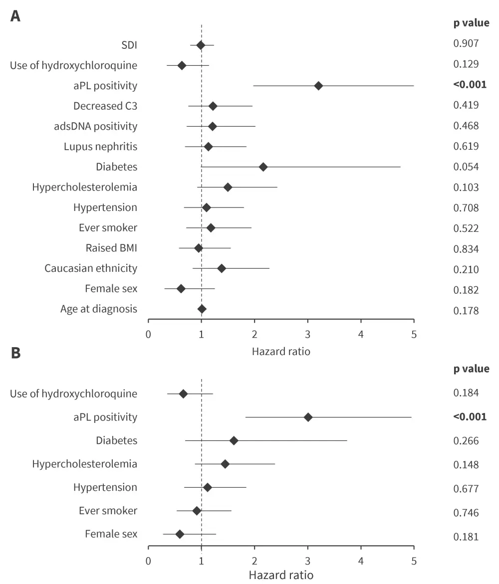 While analyzing for different types of CVEs using multivariable Cox regression, only aPL positivity was found to be significantly associated with both VTE and CVA (Figure 2).