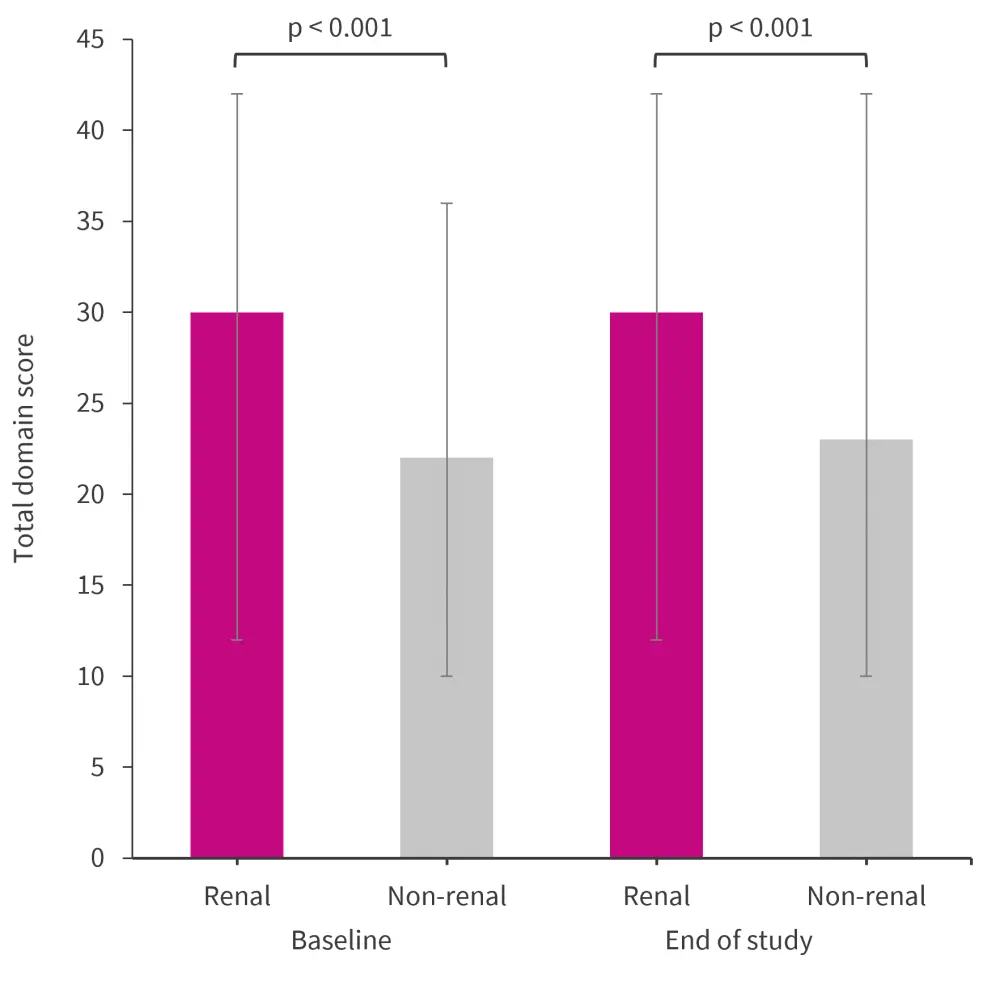 At baseline and at the end of the study, total domain scores were significantly higher for the renal group than the non-renal group (Figure 2).