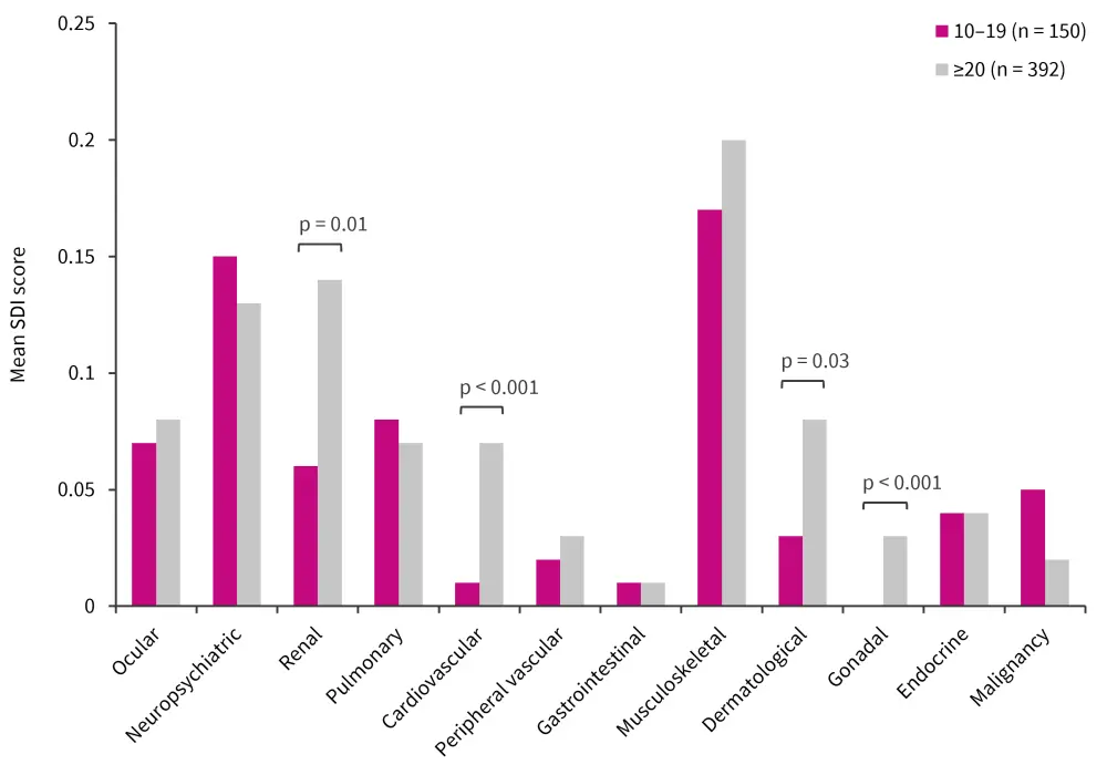 Overall, 42.8% of patients had an SDI score ≥1, indicating organ damage at their last clinic visit. The SDI scores for both groups are shown in Figure 1, with the significantly different categories indicated. The total SDI score for patients with scores 10–19 was 0.67 (standard deviation [SD], ±1.03), this was significantly lower than 0.90 (SD, ±1.26) recorded for the ≥20 score group (p = 0.04).
