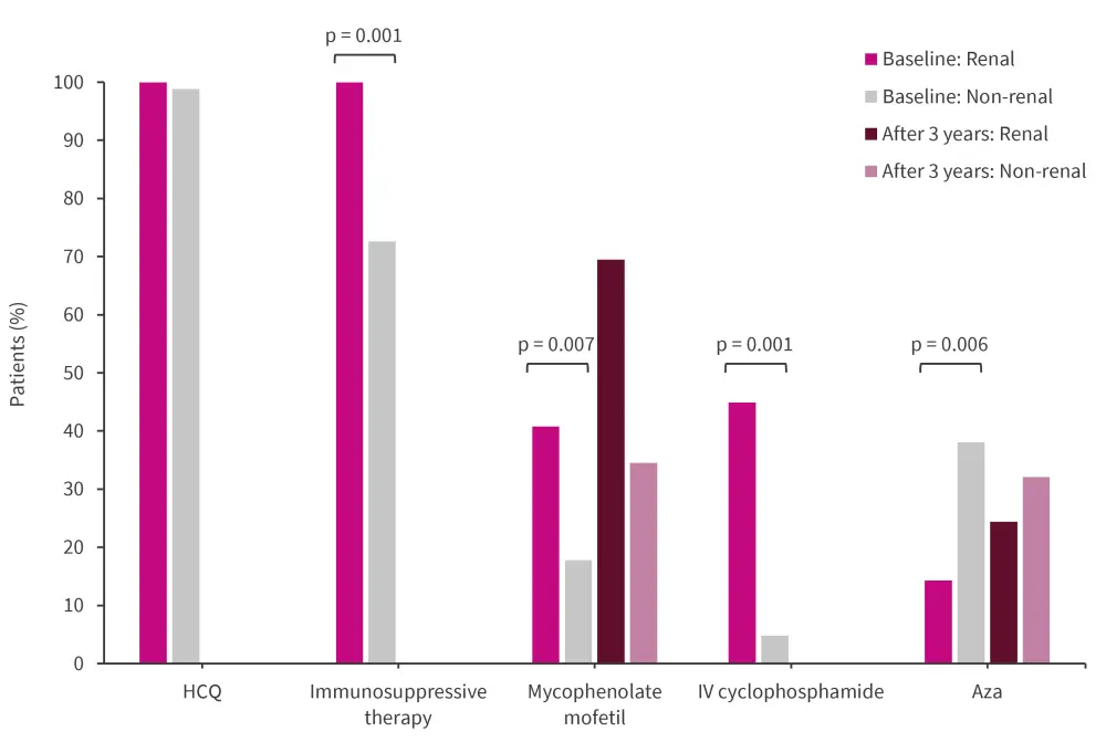 Higher use of all therapeutic agents listed, except for azathioprine, were seen in the renal group compared with the non-renal group. After 3 years, a decrease was seen in GC use in both groups, whereas the use of mycophenolate mofetil significantly increased (p = 0.008; Figure 5).