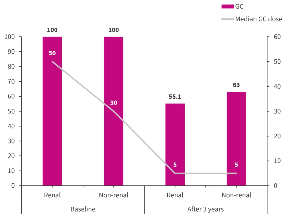 Figure 4. Glucocorticoid treatment and median dose at baseline and after 3 years*