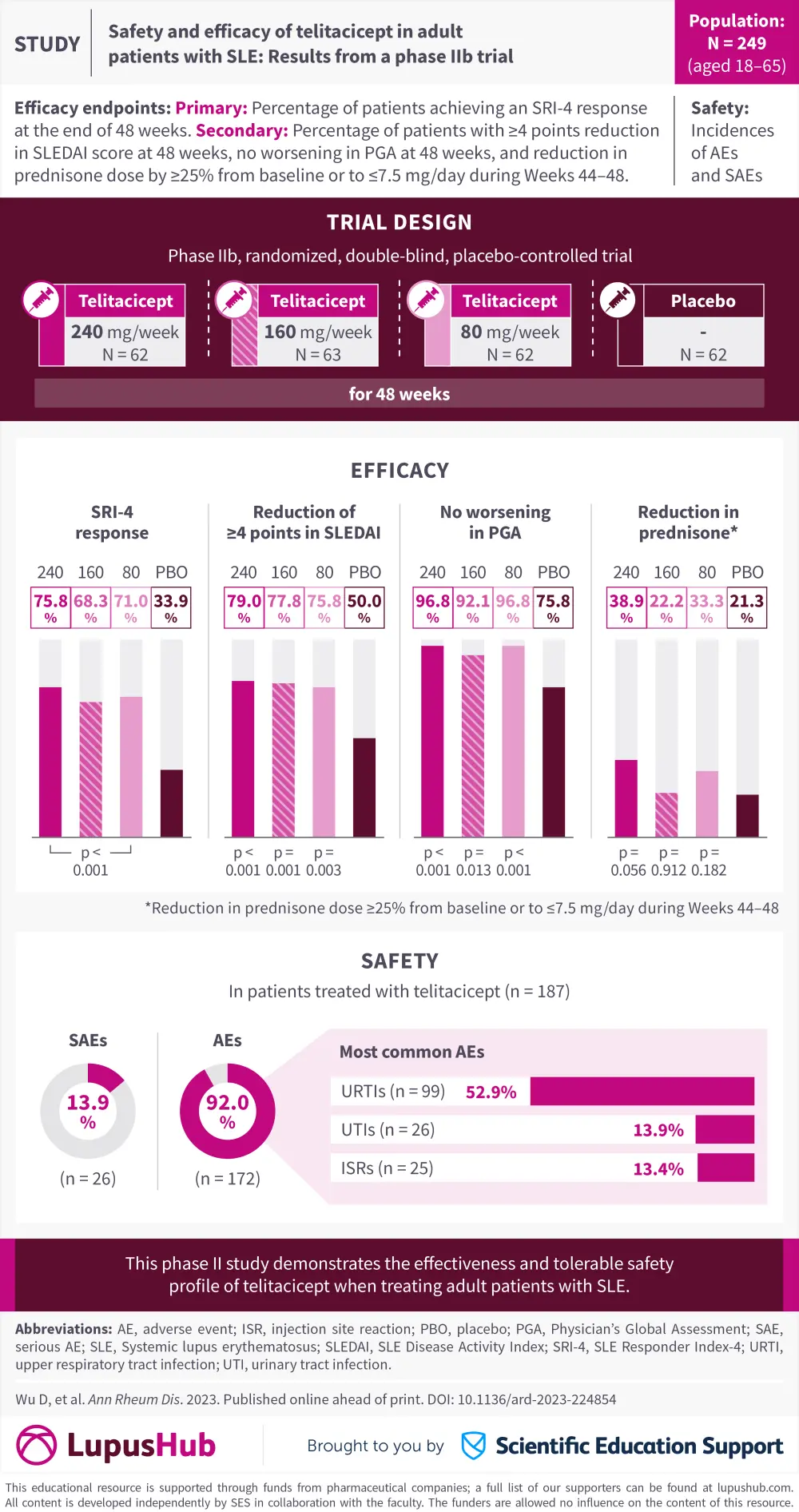 Telitacicept is a novel fusion protein that inhibits both B lymphocyte stimulator and a proliferation-inducing ligand in active systemic lupus erythematosus.1 Below, we present a visual abstract summarizing key safety and efficacy outcomes of the phase IIb study (NCT02885610) assessing telitacicept in adult patients with active systemic lupus erythematosus.